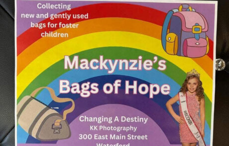 Miss Wisconsin Preteen, Mackynzie Sander, will personally deliver the collected bags to children in foster care. Many foster children move their belongings in trash bags — let’s help give them something they can carry with dignity.
